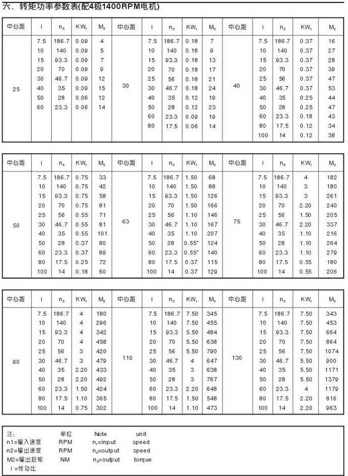 轉矩功率參數表(配4級1400RPM電機)