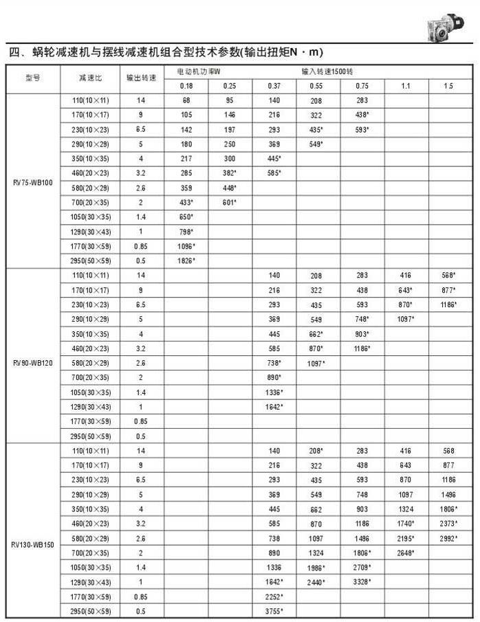蝸輪減速機與擺線減速機組合型技術參數表(輸出扭矩N.M)二