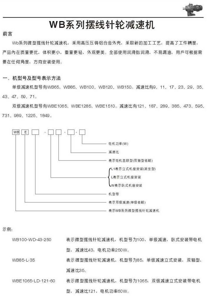 WB系列微型擺線針輪減速機描述機型號和規格表示法